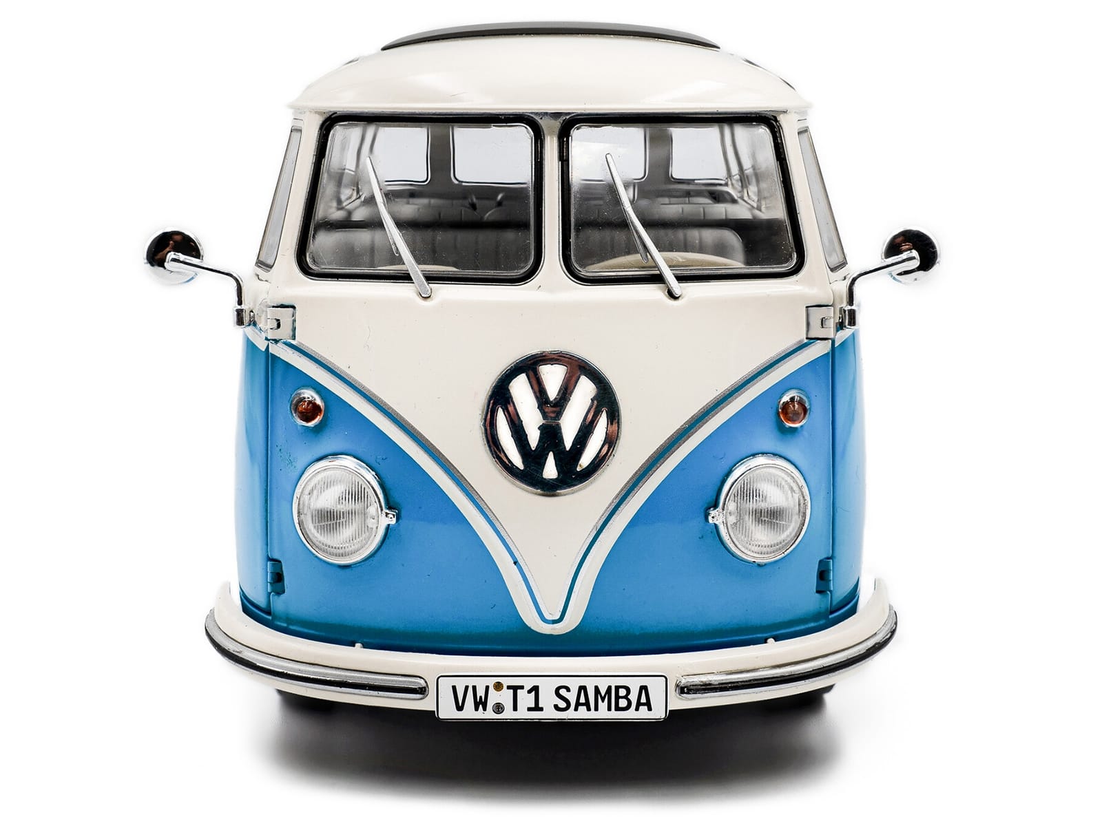 - Brand new 1/18 scale diecast car model of 1962 Volkswagen T1 Samba Bus Baby Blue and White die cast model car by Solido.