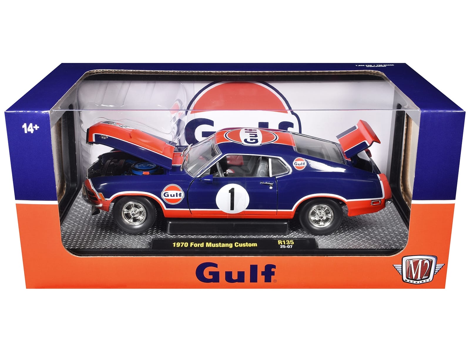 - Brand new 1/24 scale diecast car model of 1970 Ford Mustang Custom #1 “Gulf Oil” Dark Blue with Orange Graphics Limited Edition to 7850 pieces Worldwide die cast model car by M2 Machines.