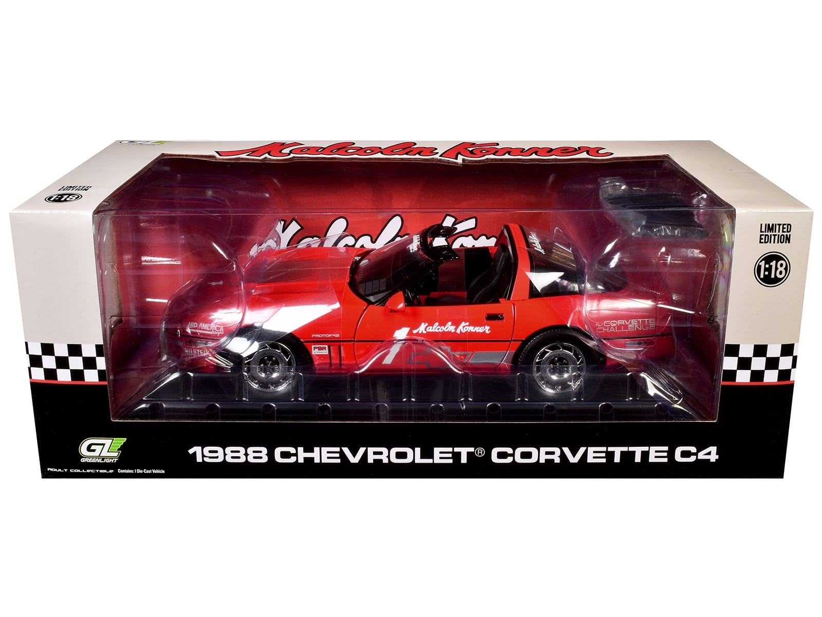 - Brand new 1/18 scale diecast car model of 1988 Chevrolet Corvette C4 #1 Malcolm Konner “Corvette Challenge Race Car” Red with Black Top die cast model car by Greenlight.