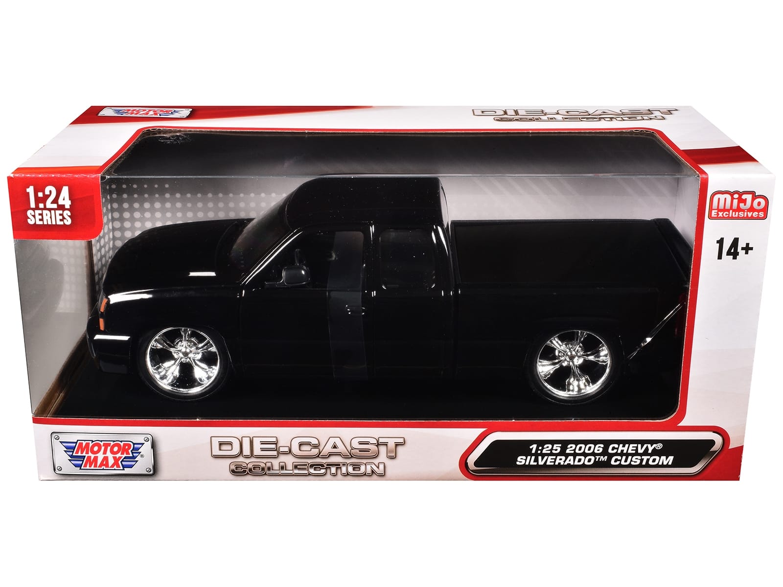 - Brand new 1/25 scale diecast model car of 2006 Chevrolet Silverado Custom Pickup Truck Black “Die-Cast Collection” Series die cast car model by Motormax.