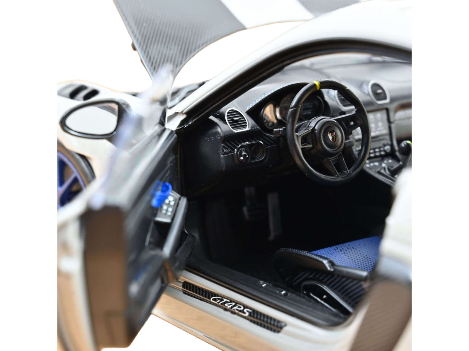 - Brand new 1/18 scale diecast car model of 2023 Porsche Cayman GT4 RS Weissach Pack Chalk Gray with Carbon Hood Stripes die cast model car by Norev.