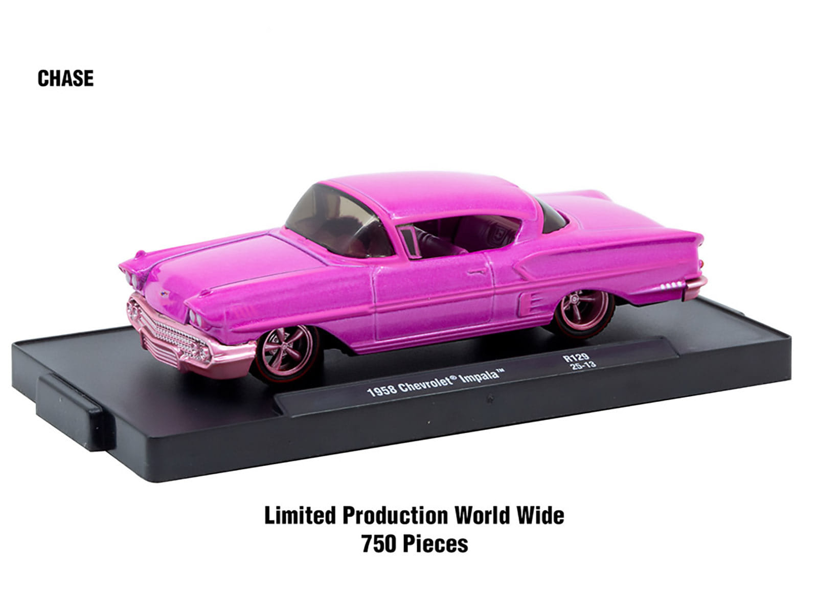 - CHASE CAR:Â 1958 Chevrolet Impala. The body is pink, the bumpers, grill, trim and wheels are pink chrome, the interior is pink. Limited Edition to 750 pieces Worldwide.
