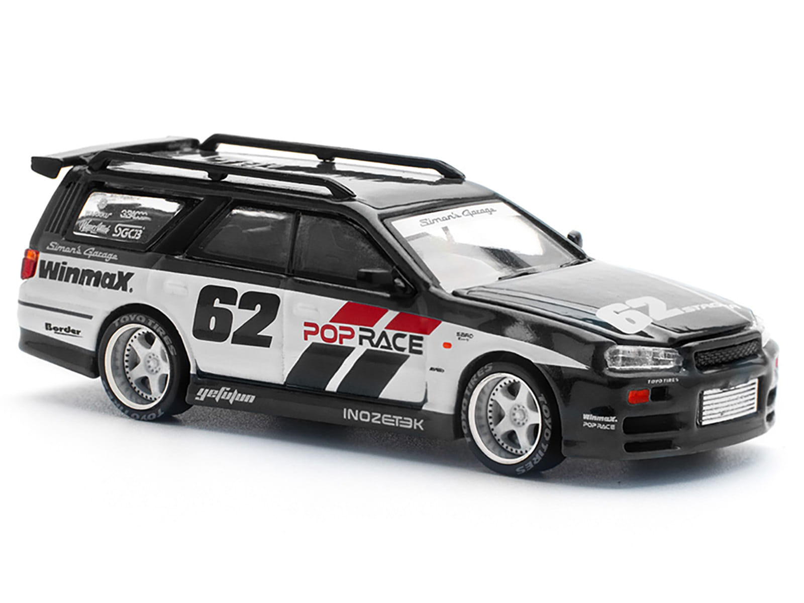GT-R Stagea RHD (Right Hand Drive) #62 “Simon’s Garage” Black with White Sides 1/64 Diecast Model Car by Pop Race