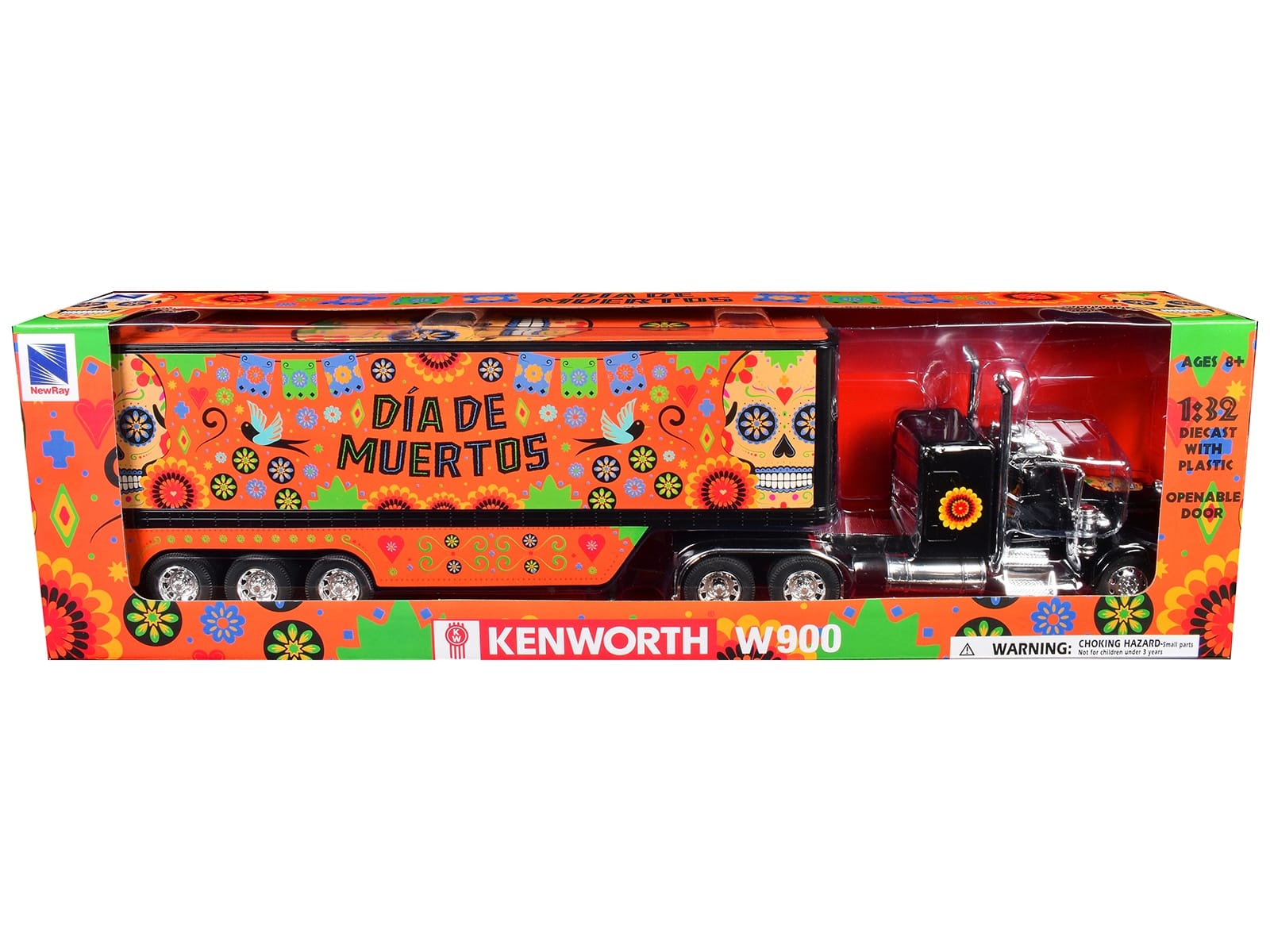 - Brand new 1/32 scale diecast model of Kenworth W900 Truck Black with Graphics and Dry Van Trailer “Dia De Muertos” die cast model by New Ray.
