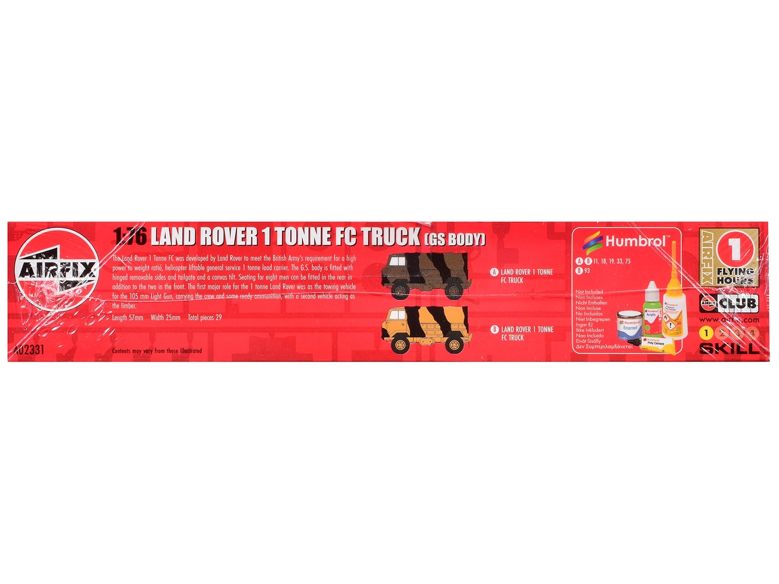 - Brand new plastic model kit of Land Rover 1 Tonne FC Truck (GS Body) with 3 Scheme Options (Level 1)Â 1/76Â plastic model kit by Airfix.