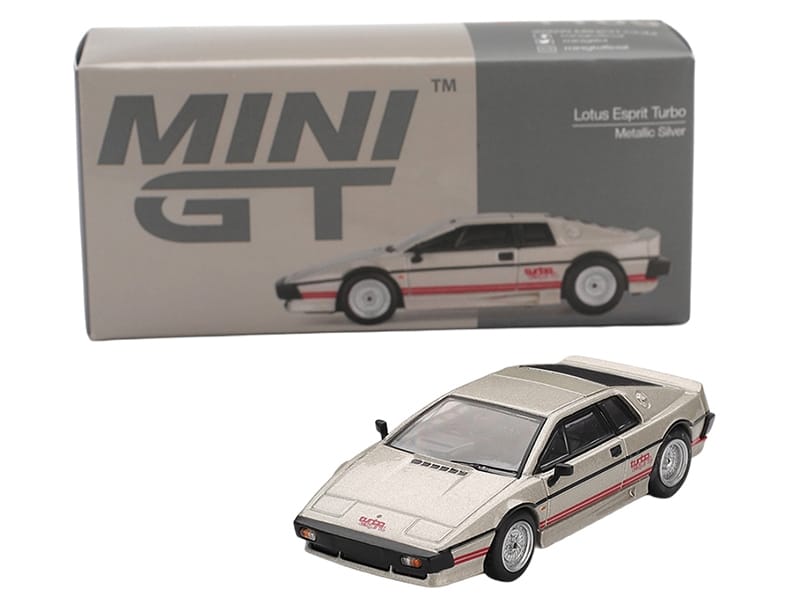 - Brand new 1/64 scale diecast car model of Lotus Esprit Turbo Silver Metallic with Red Stripes Limited Edition die cast model car by Mini GT.