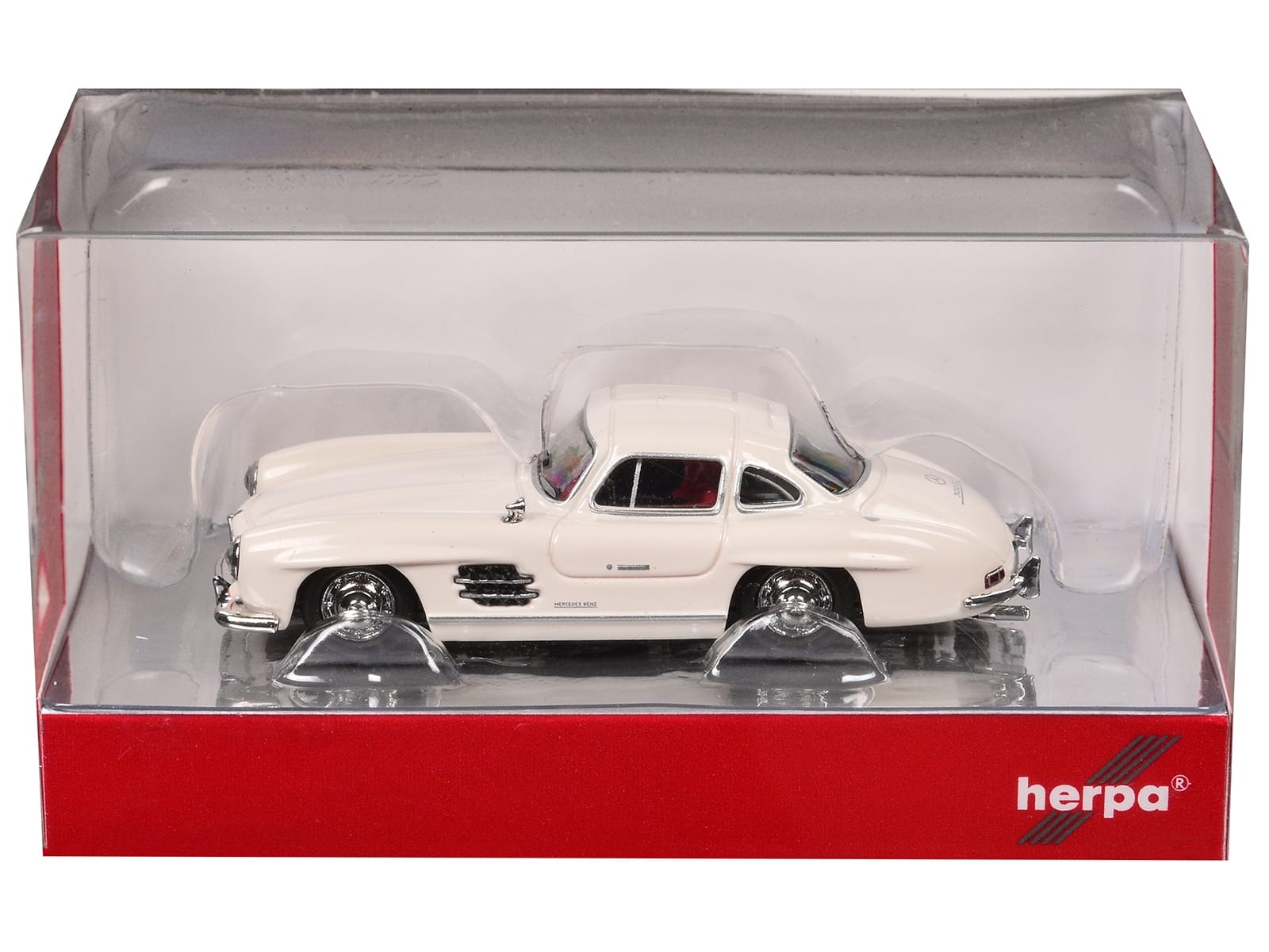 - Brand new 1/87 (HO) scale plastic car model of Mercedes-Benz 300 SL Gullwing White with Red Interior plastic model car by Promotex.