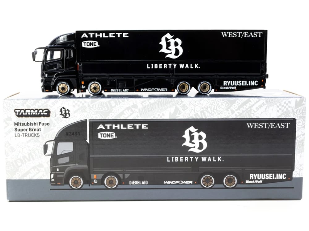 - Brand new 1/64 scale diecast car model of Mitsubishi Fuso Super Great Truck RHD (Right Hand Drive) with Transporter “Liberty Walk” Black “Truck64” Series die cast model car by Tarmac Works.