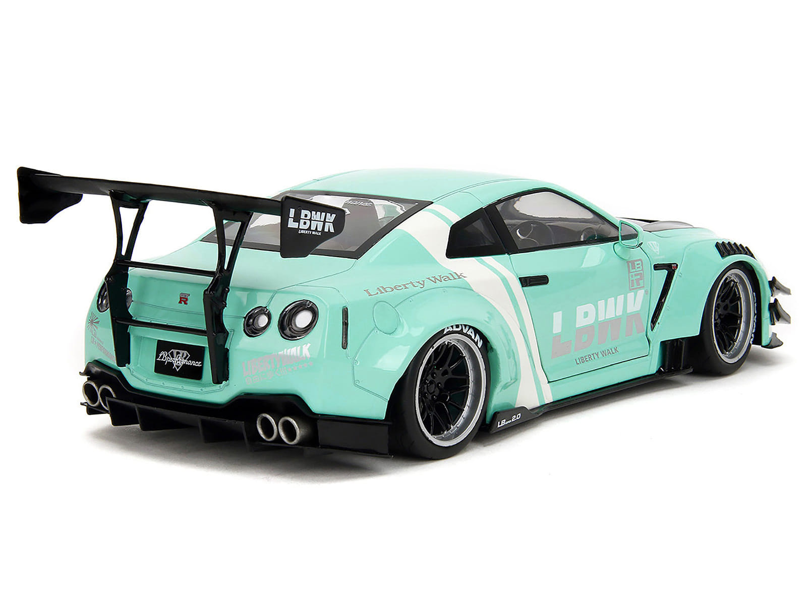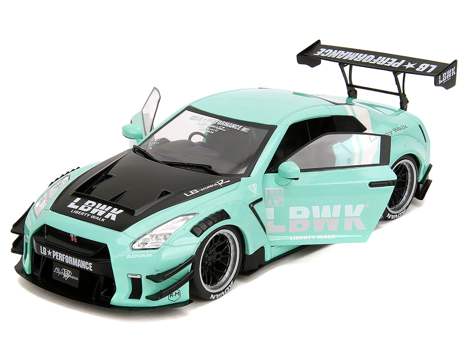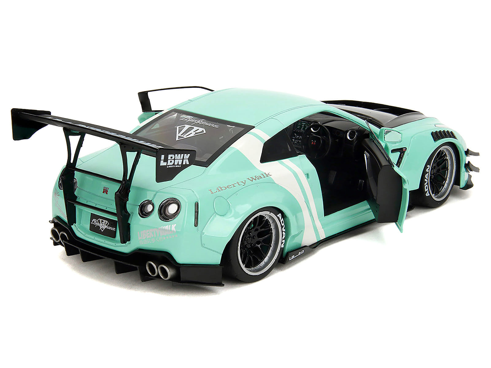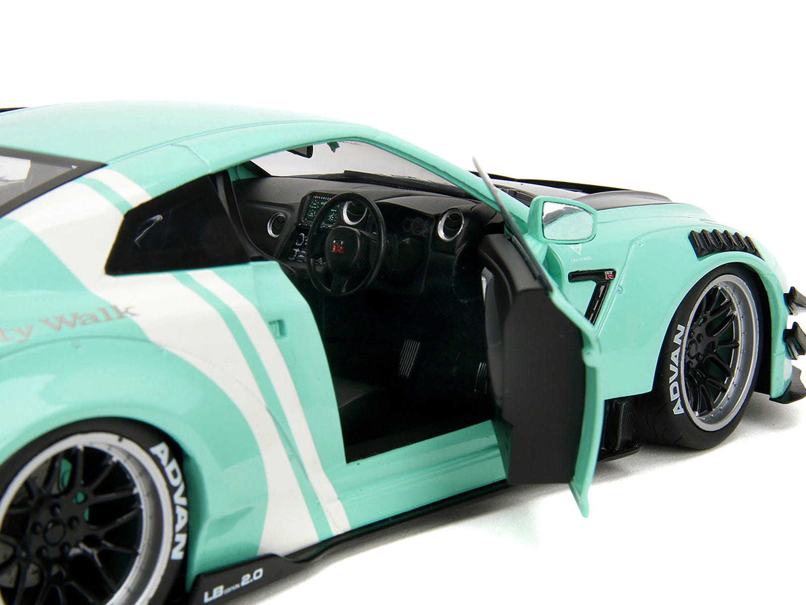 - Brand new 1/18 scale diecast car model of Nissan GT-R (R35) Liberty Walk Body Kit 2.0 RHD (Right Hand Drive) Light Blue with Black Hood and White Stripes “Pink Slips” Series die cast model car by Jada.