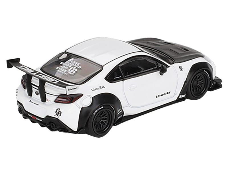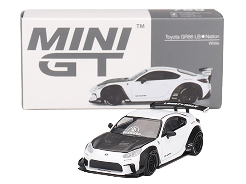 - Brand new 1/64 scale diecast car model of Toyota GR86 “LB-Nation – Liberty Walk” White with Carbon Hood Limited Edition die cast model car by Mini GT.